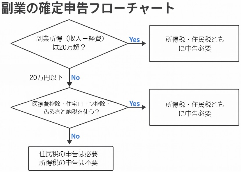 所得税の場合:副業の所得(=収入−経費)が年間20万円以下であれば、所得税の確定申告は不要。